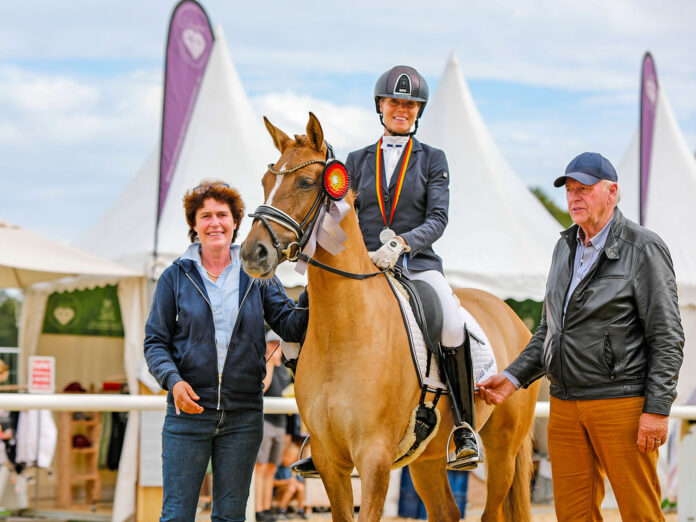 Annette Scherkamp-Böge (v. li.), Mareike Peckholz und Peter Böge, hier mit Steendieks Tiffany, die 2024 auf dem Bronzerang lag, kommen seit Jahren nach Warendorf. Foto: Malina Blunck