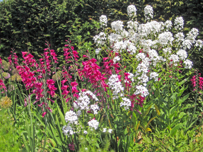 Die weißen Blüten der Nachtviole ‚Alba‘ bilden einen schönen Kontrast zur Wildgladiole. Fotos: Karin Stern