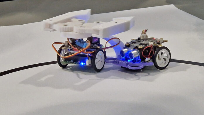 Bei der Aufgabe „Sumobot“ treten zwei Roboter in einer kreisförmigen Arena gegeneinander an. Wer den Gegner zuerst aus der Arena schiebt, hat gewonnen.