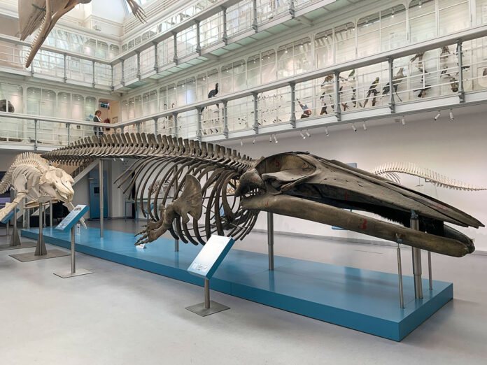 Seit 1881 dominiert das Skelett einer jungen Blauwalkuh die mit Oberlicht versehene Schauhalle.